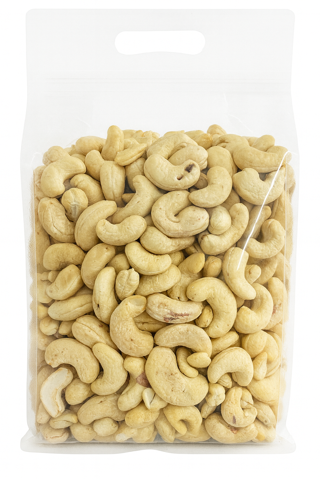 Noix de cajou entières, 100% naturelles et non grillées, pour conserver toutes leurs qualités nutritionnelles et leur saveur douce.